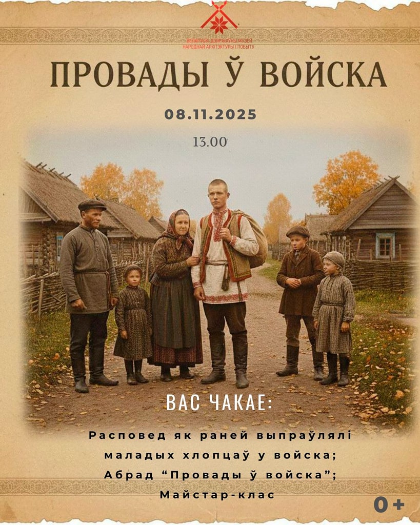 Таму запрашаем усіх жадаючых у гэты восеньскі дзень наведаць Беларускі дзяржаўны музей народнай архітэктуры і побыту, каб пазнаёміцца з тым, як нашыя продкі праваджалі хлопцаў у войска.